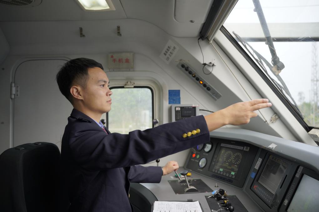 作為第10萬列中歐班列的駕駛員,李峰穩(wěn)步登上駕駛室,緩解制動機、推動前進手柄……熟練地完成一系列發(fā)車前準(zhǔn)備工作,列車緩緩啟動。