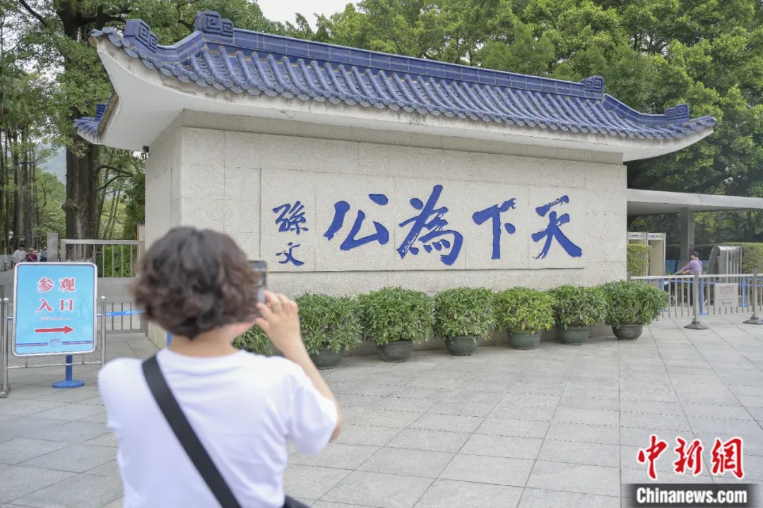 2024年3月30日,孫中山故居紀(jì)念館外正門處的“天下為公”石碑吸引游客。中新社記者 陳驥旻 攝