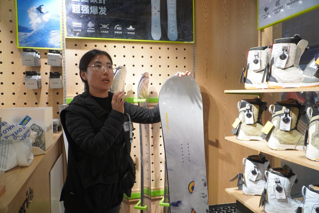 位于吉林省北大湖滑雪度假區(qū)的國產(chǎn)滑雪裝備品牌Overide門店內(nèi),店長賈曉娜在介紹滑雪板性能。新華社記者孫逸軒 攝