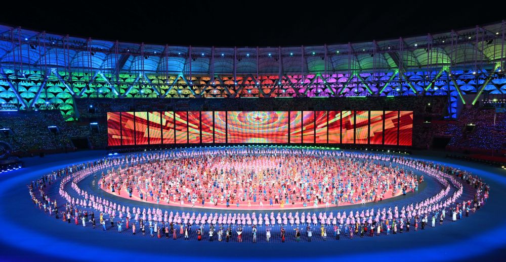 舞臺中間是一個圓形地屏,地屏外圈,導(dǎo)演組專門增加“星空矩形”地毯,圍繞中心地屏影像始終保持圓形圖案,構(gòu)成“同心圓”;在入場儀式、節(jié)目展演、點(diǎn)燃火炬等多個環(huán)節(jié),身穿各民族傳統(tǒng)服飾的參賽人員、表演者等,多次在舞臺匯聚成“同心圓”;“一顆心,一個圓,一齊擁抱緊相連……”“同心圓”概念也在主題曲中彰顯。