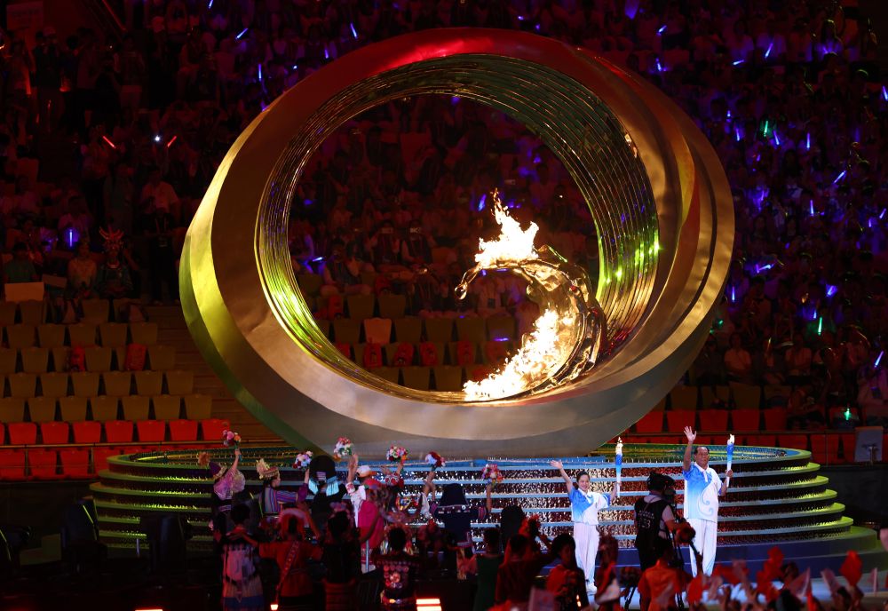 在12名火炬手的接力傳遞下,最終由王書茂和符攀嬋共同點(diǎn)燃主火炬,水與火在這座熱情的海島城市交相輝映。