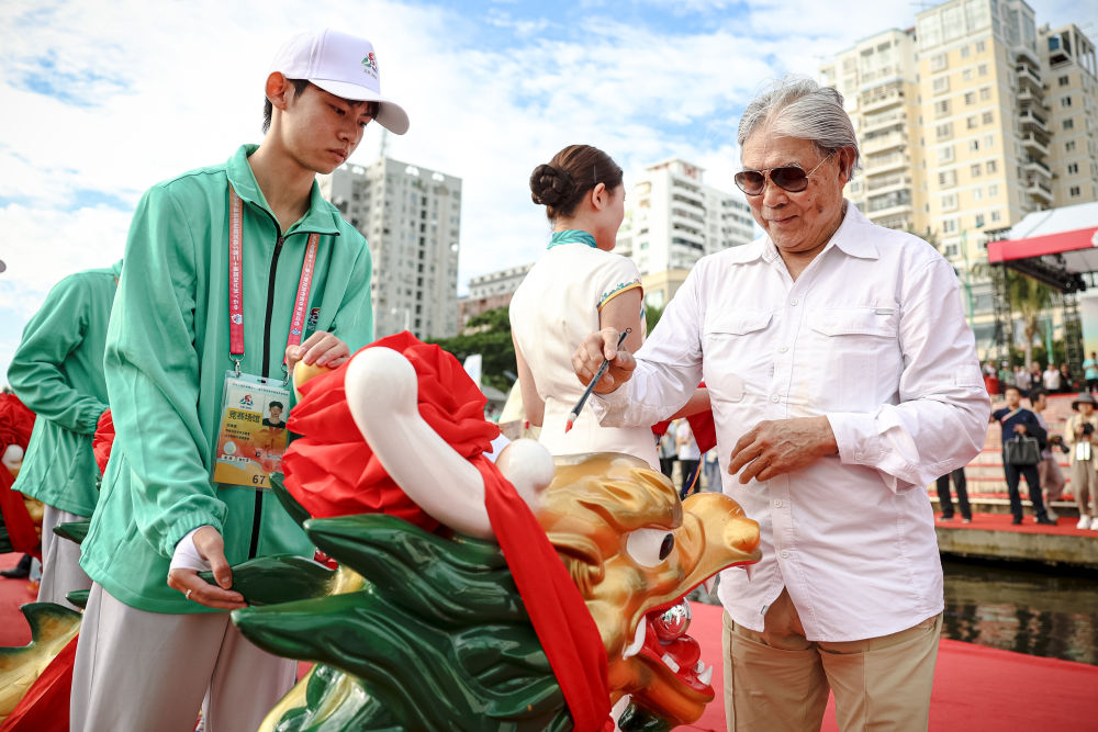 11月23日,中國香港體育協(xié)會暨奧林匹克委員會會長霍震霆(右一)在賽前儀式上為龍舟“點睛”。新華社記者 江漢 攝
