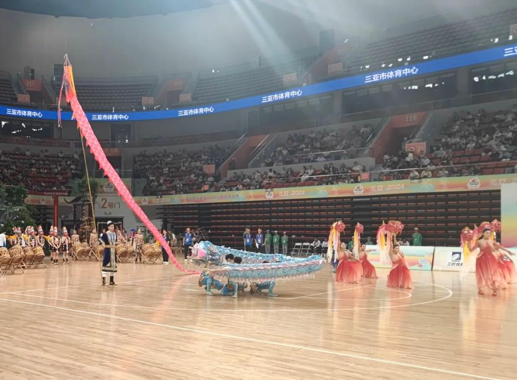 唐寶(左)手持巨龍,在本屆運動會表演項目比賽中。受訪者供圖