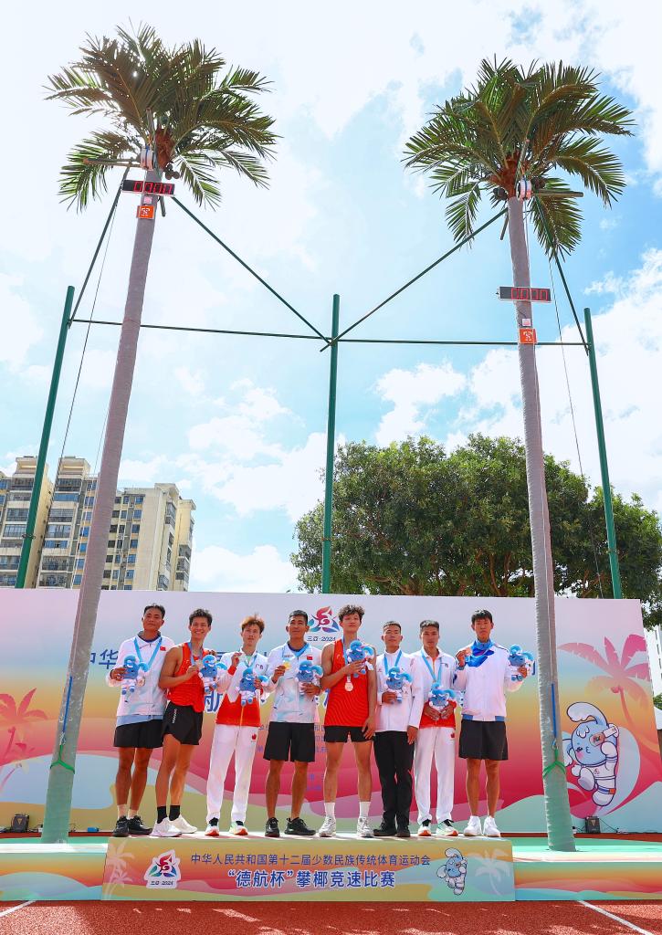 11月24日,獲獎(jiǎng)選手在頒獎(jiǎng)儀式上合影。當(dāng)日,第十二屆全國少數(shù)民族傳統(tǒng)體育運(yùn)動(dòng)會(huì)攀椰競(jìng)速男子9米決賽在西南大學(xué)三亞中學(xué)體育場(chǎng)舉行。新華社記者 楊植森 攝