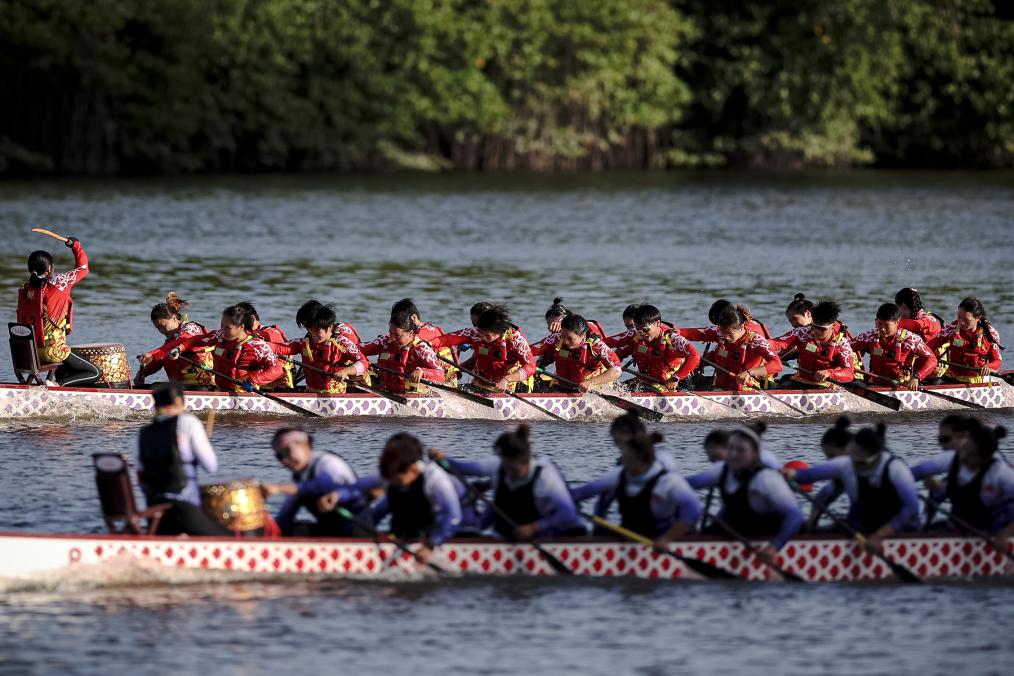 當(dāng)天還進(jìn)行了龍舟項(xiàng)目的多場(chǎng)決賽,廣東隊(duì)曾德林奪得標(biāo)準(zhǔn)龍舟混合直道競(jìng)速200米一等獎(jiǎng)。曾多次斬獲國際龍舟賽事冠軍的他表示,在三亞這些天就像參加一場(chǎng)全民族的家庭聚會(huì),與其他隊(duì)伍也會(huì)相互加油、打氣,比賽氛而融洽。