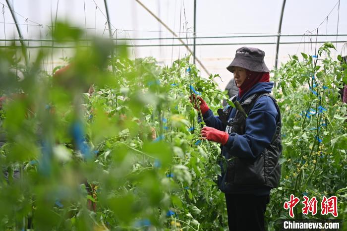馬芬蓮和工友們忙著給番茄苗整枝打杈,她額頭上因地震房屋倒塌留下的疤痕仍清晰可見。與記者交流時,不時有同村婦女打來視頻電話咨詢種植問題。