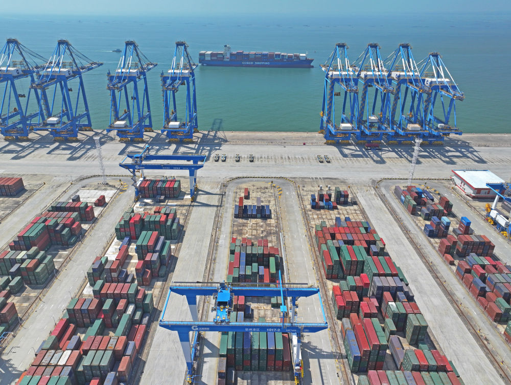 10月13日,一艘集裝箱貨輪正在前往廣西北部灣港欽州港區(qū)碼頭(無人機照片)。新華社記者 周華 攝