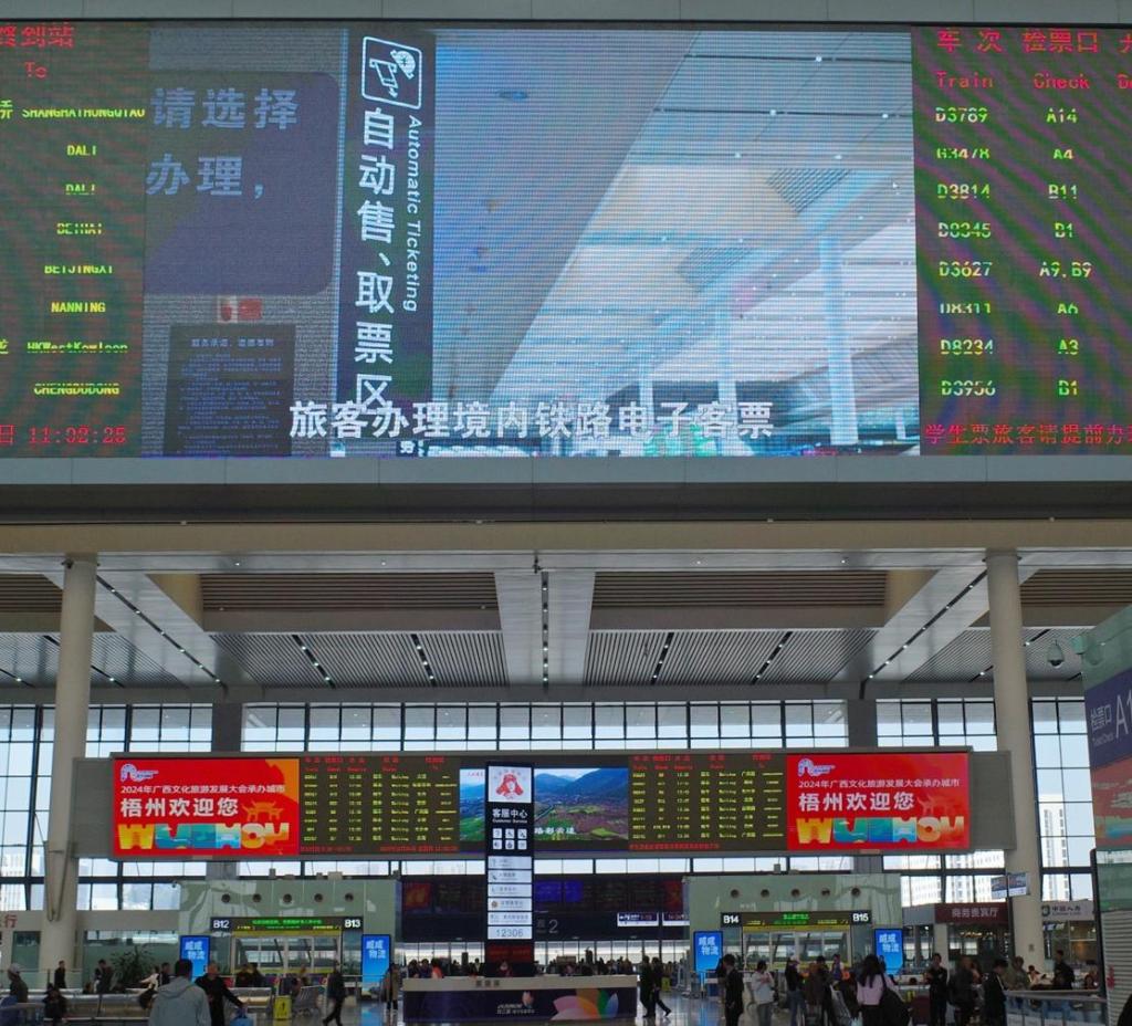12月1日,在廣西南寧市南寧東站,記者看到車站大屏幕上,鐵路電子客票服務宣傳片正在滾動播放。