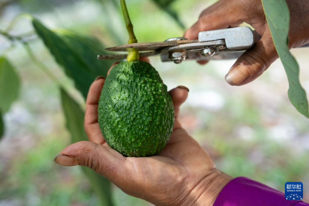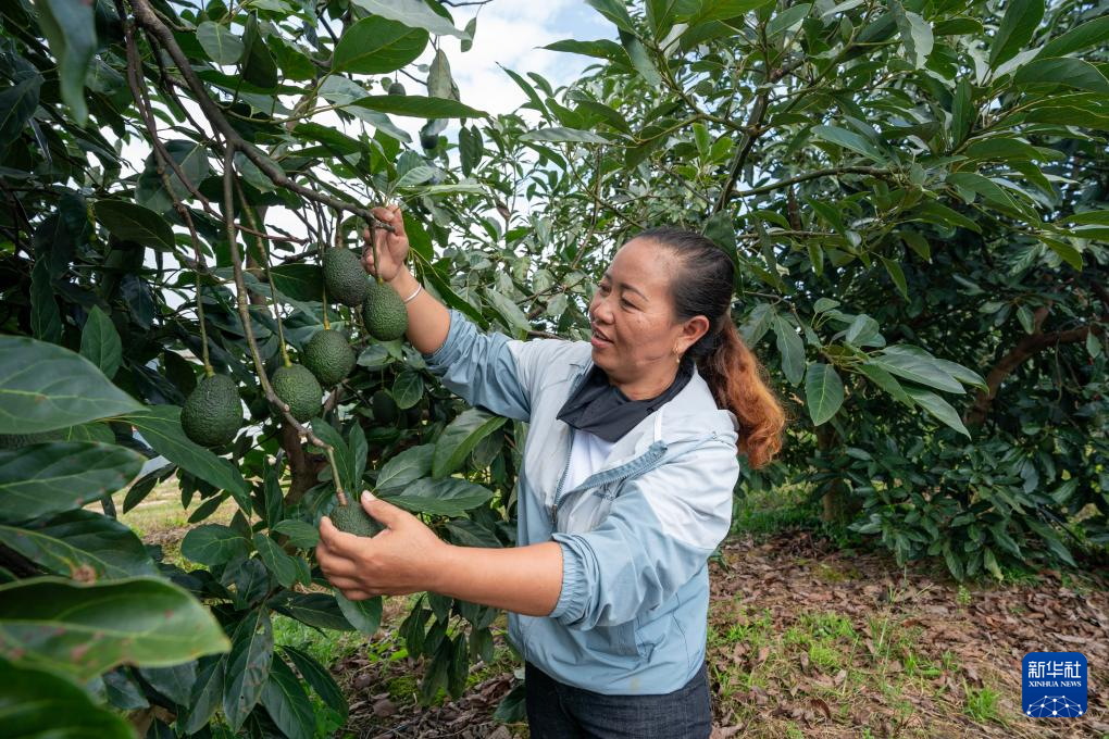 由企業(yè)在當?shù)剞r(nóng)民中培訓的產(chǎn)業(yè)技術人員李美瓊在一處牛油果種植基地檢查待采的牛油果(10月29日攝)。新華社記者 陳欣波 攝
