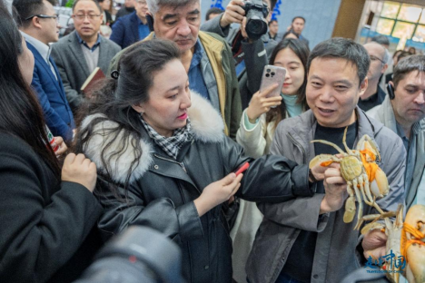 外國(guó)記者一邊查看青蟹一邊密集提問(wèn)
