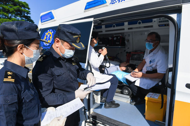 在深圳灣口岸深圳一側(cè),海關(guān)工作人員對參加第二次粵港跨境直通救護車演練的救護車進行出境前的查驗(2024年10月31日攝)。新華社記者 毛思倩 攝