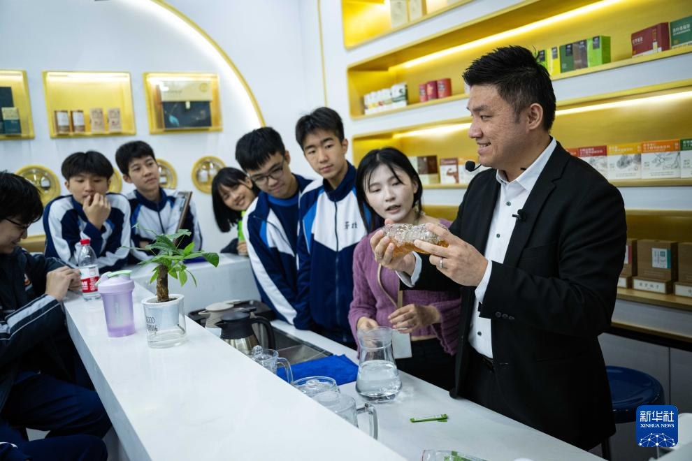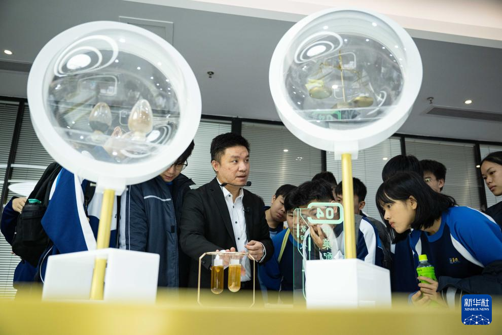 12月11日,黃滋才(右一)在位于橫琴的分子態(tài)(珠海橫琴)中醫(yī)藥健康產(chǎn)業(yè)發(fā)展有限公司的植物(現(xiàn)代中藥)分子博物館內(nèi)與澳門勞校中學(xué)的學(xué)生交流。