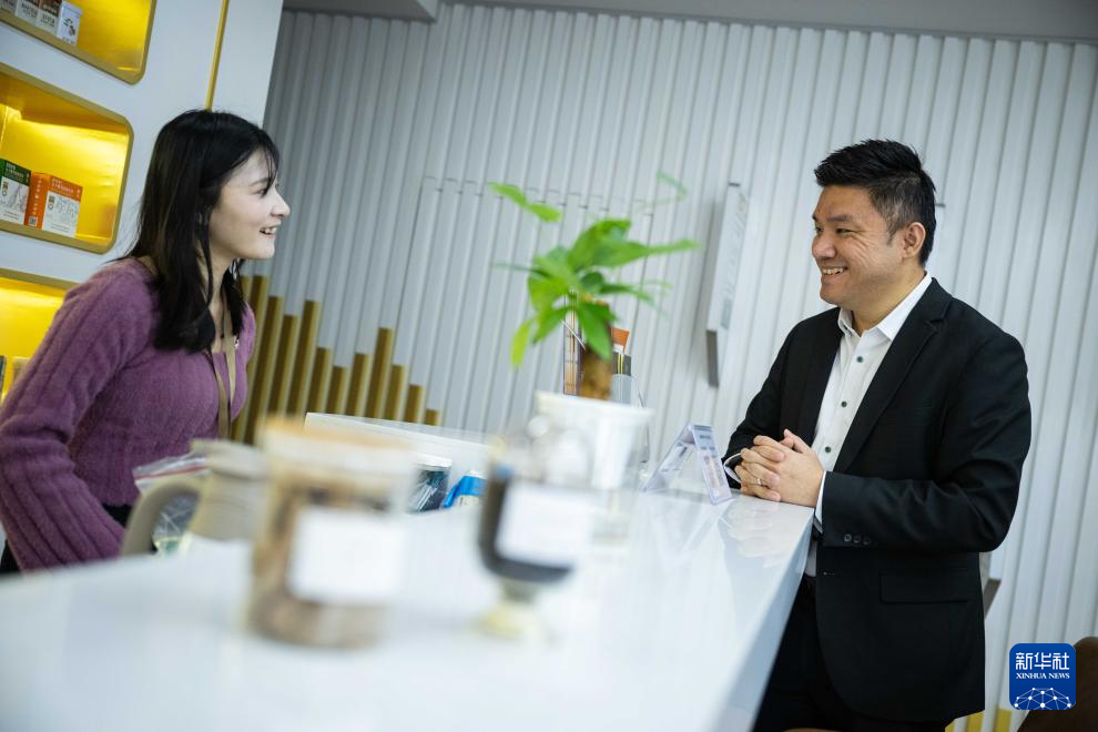 12月11日,黃滋才(右)在位于橫琴的分子態(tài)(珠海橫琴)中醫(yī)藥健康產(chǎn)業(yè)發(fā)展有限公司與同事聊天。