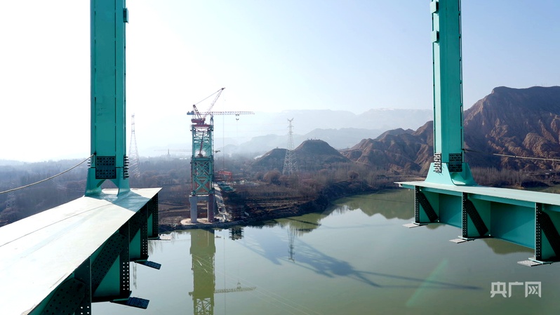 圖為12月20日拍攝的尖扎黃河特大橋施工現(xiàn)場(chǎng)(央廣網(wǎng)記者 汪曉青 攝)