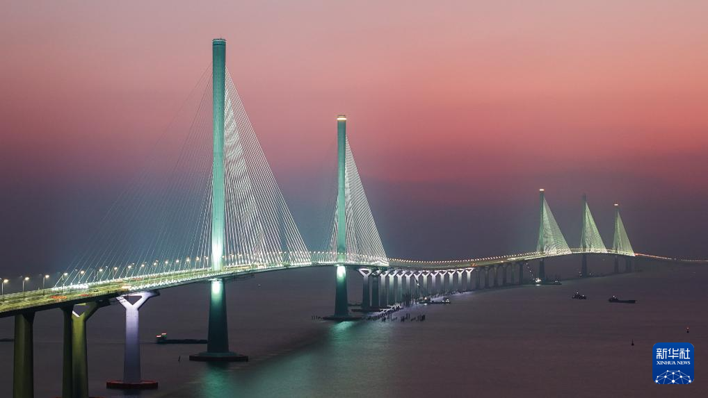 暮色中的黃茅海跨海通道高欄港大橋(左側(cè)雙主塔)和黃茅海大橋(右側(cè)三主塔)(2024年12月7日攝,無人機(jī)照片)。