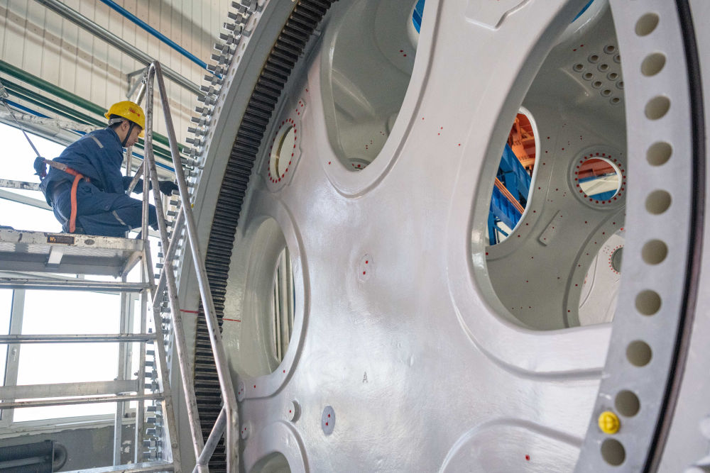 工人在位于黑龍江省齊齊哈爾市的中國一重集團有限公司風電設備裝配車間加工風電輪轂(4月28日攝)。新華社記者 謝劍飛 攝