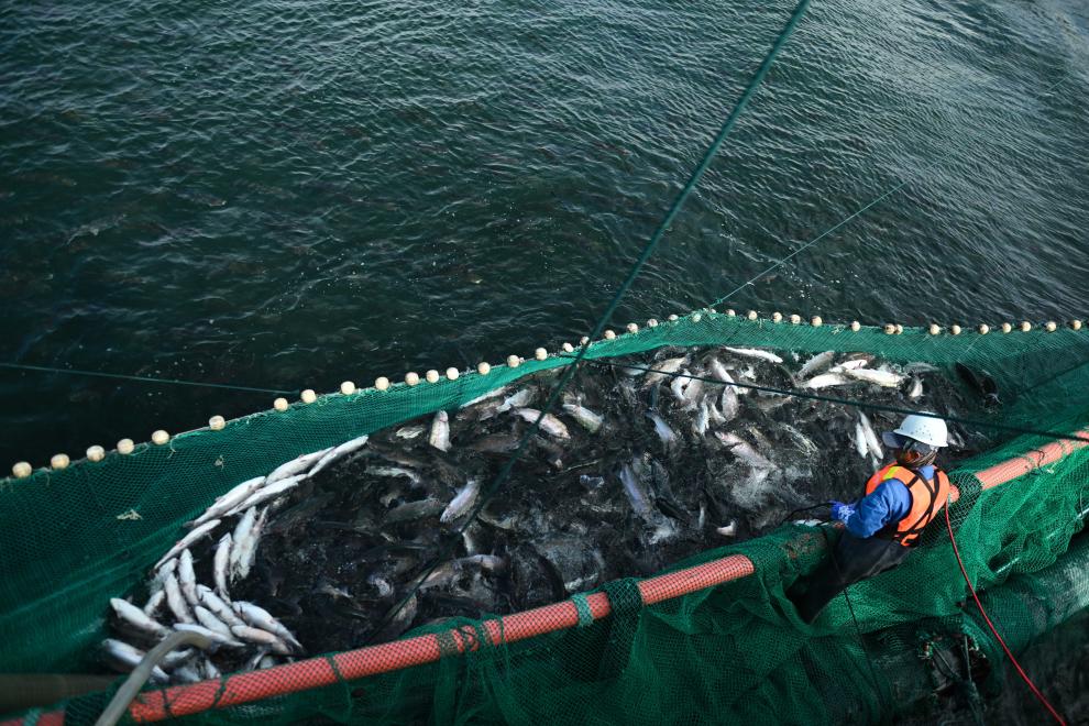 “傳統(tǒng)吊網(wǎng)捕撈會(huì)讓虹鱒魚(yú)體內(nèi)因緊張產(chǎn)生更多肌酸。我們現(xiàn)在用吸魚(yú)泵連魚(yú)帶水直接送入車(chē)間,保證魚(yú)肉質(zhì)鮮嫩?!彼f(shuō)。