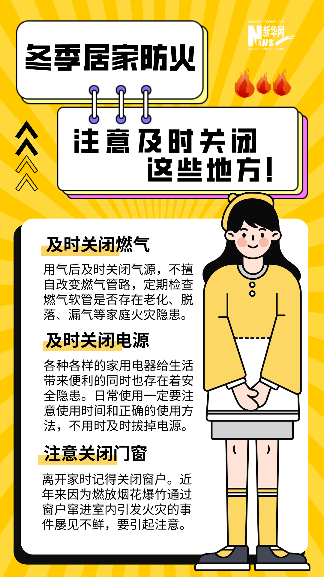 男子在家中用火盆取暖時,不慎引燃身上衣物;女子在電暖器上晾衣服引發(fā)火災(zāi);母子二人因在家中燒煤取暖、通風(fēng)不暢導(dǎo)致一氧化碳中毒......冬季天氣寒冷干燥,晝夜溫差大,生活用火、用氣、用電增加。若疏忽大意,極易引發(fā)火災(zāi)。安全過冬,居家防火這些細節(jié)要注意。