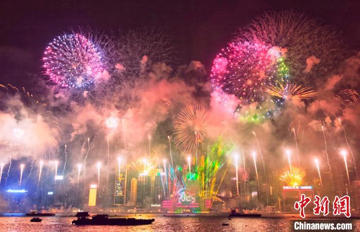 “5、4、3、2、1,新年快樂?!卑殡S著尖沙咀鐘樓敲響新年鐘聲,從5艘躉船、16艘浮船上燃放的煙花在空中綻放,點(diǎn)亮自北角至中環(huán)約1300米的夜空,煙花、音樂、燈光表演與維港夜景相映成趣,成為夜空中絢爛圖畫。