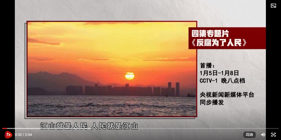 由中央紀委國家監(jiān)委宣傳部與中央廣播電視總臺聯(lián)合攝制的四集電視專題片《反腐 為了人民》,將于1月5日至8日在中央廣播電視總臺央視綜合頻道晚8點檔播出。