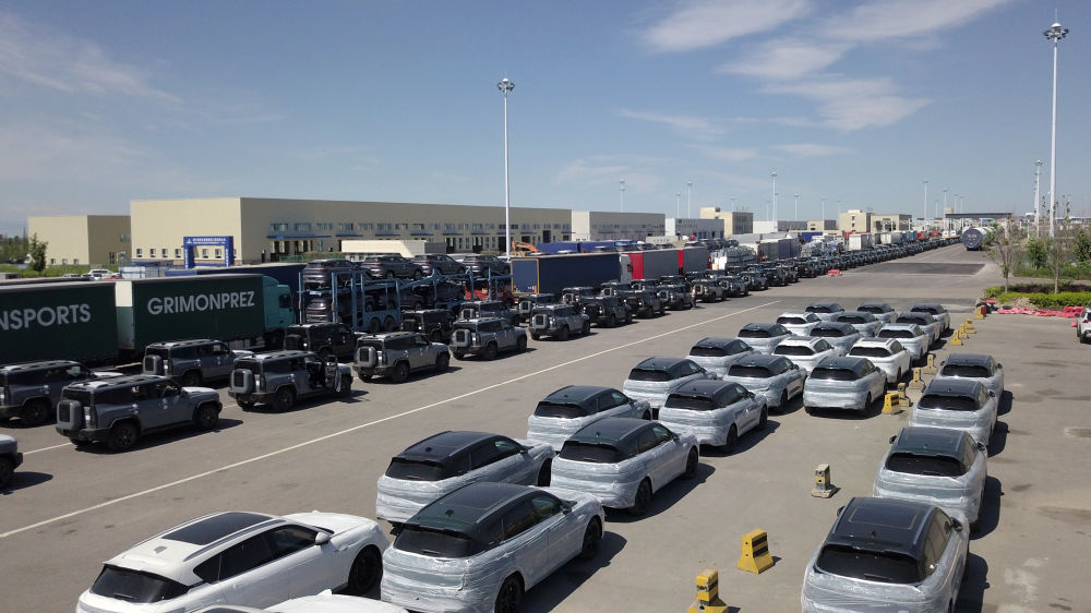7月11日,在新疆霍爾果斯公路口岸,出口車輛排隊等待查驗出關(guān)(無人機照片)。作為全國最大的汽車出口陸路口岸——霍爾果斯口岸今年汽車整車出口數(shù)量迅猛增長。