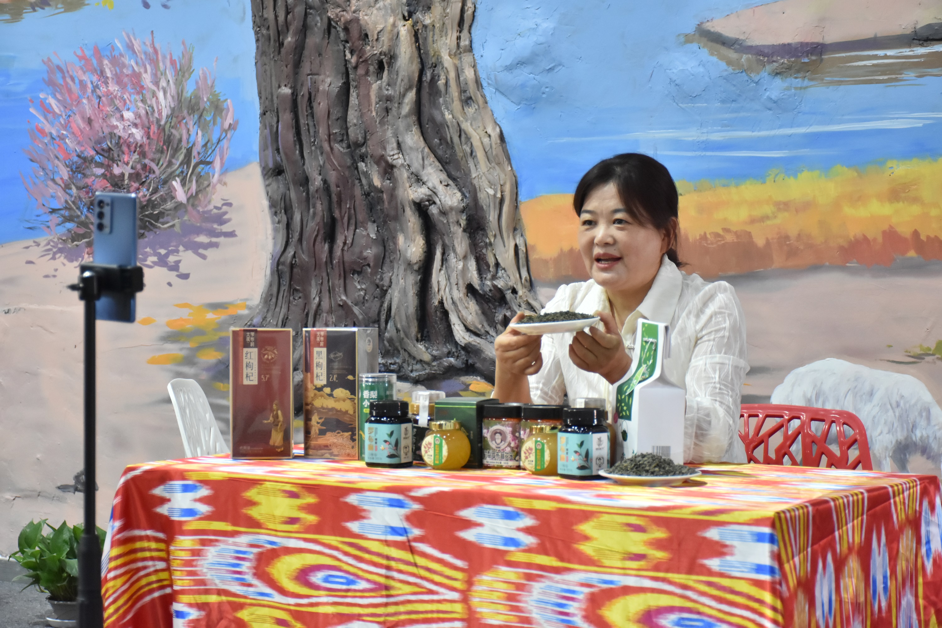 因為電商發(fā)展而受益的不只王曉紅。羅布麻茶、羅布麻蜜、尉犁小油馕、庫爾勒香梨、若羌紅棗、昆侖雪菊……走進總面積近3000平方米的尉犁縣電商直播基地,100多種優(yōu)質農特產品整齊排列,不少主播正在直播。