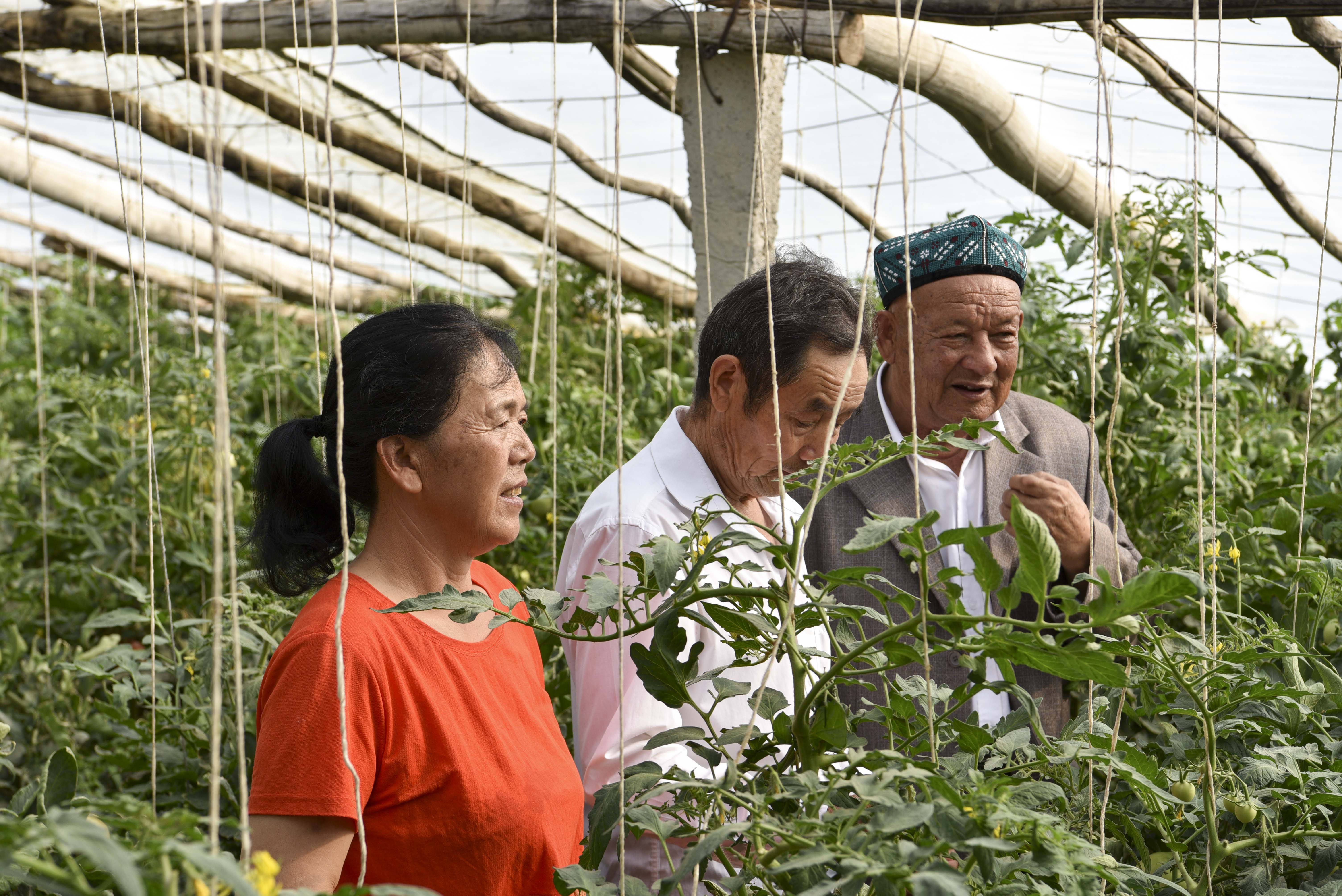沙吾爾·芒力克(右一)和村民交流蔬菜種植經驗。白佳麗 攝