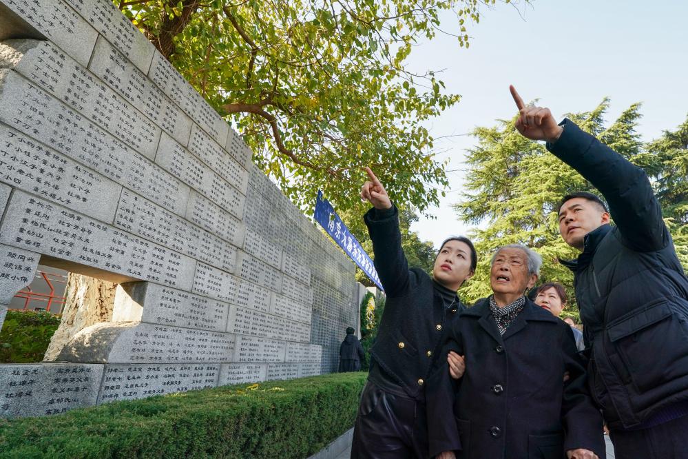 在南京大屠殺死難者家庭祭告活動中,艾義英(右二)和家人在侵華日軍南京大屠殺遇難同胞紀(jì)念館的“哭墻”上尋找家人姓名(2024年12月1日攝)。新華社記者 李博 攝
