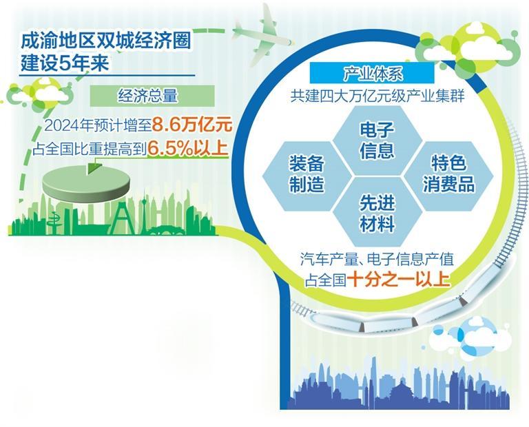 一是具有全國影響力的重要經(jīng)濟(jì)中心建設(shè)實現(xiàn)新躍升。經(jīng)濟(jì)總量上,雙城經(jīng)濟(jì)圈地區(qū)生產(chǎn)總值5年邁上了兩個萬億元級臺階,2024年預(yù)計增至8.6萬億元,占全國的比重由6.3%提高到6.5%以上;產(chǎn)業(yè)體系上,兩地共建電子信息、裝備制造、先進(jìn)材料、特色消費品四大萬億元級的產(chǎn)業(yè)集群,汽車產(chǎn)量、電子信息產(chǎn)值占全國十分之一以上。