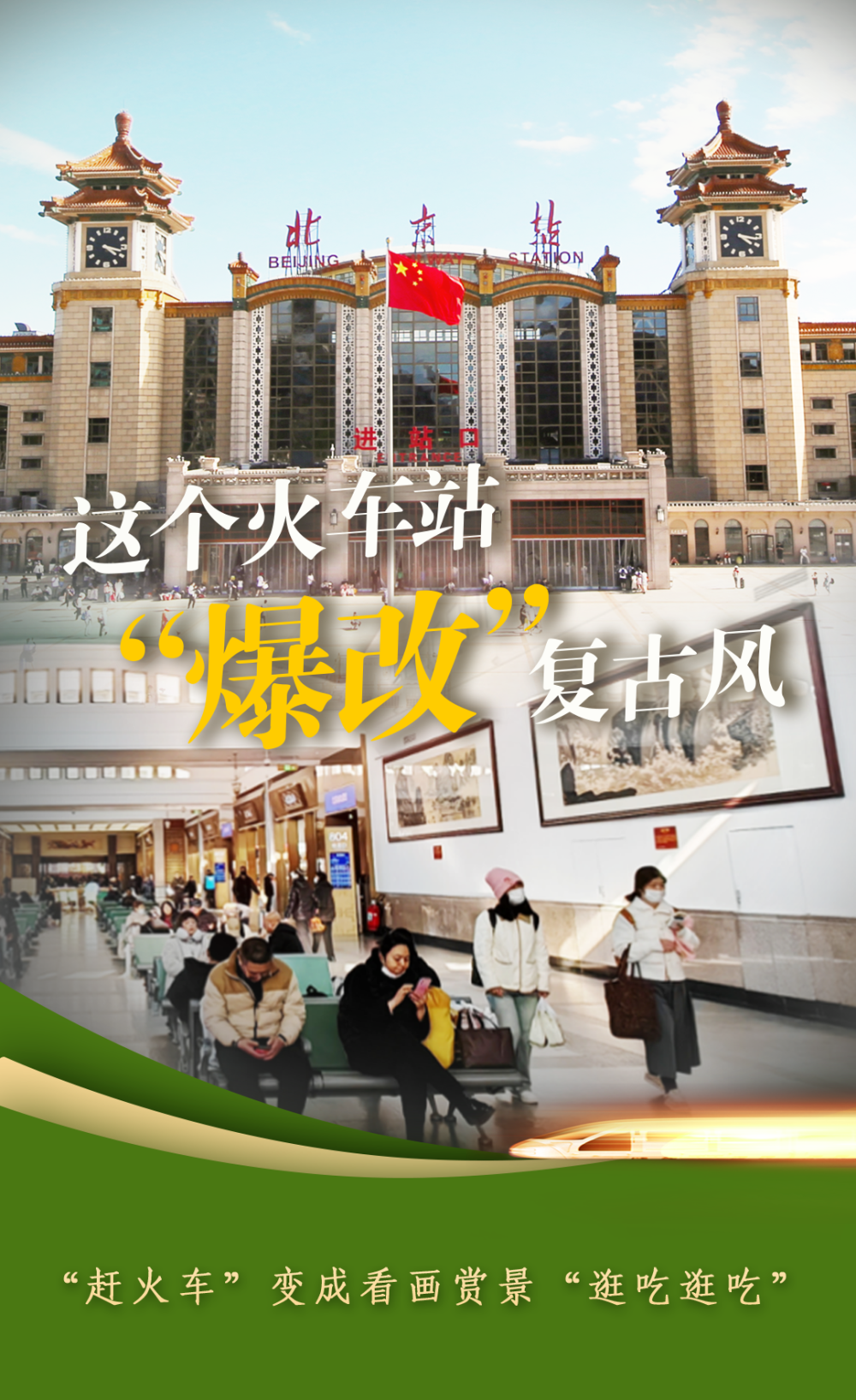 北京站之變折射出中國鐵路之變。文化味濃了,封閉的門拆了,洗手的水熱了,廁所的味沒了。今年春運(yùn),全國鐵路發(fā)送旅客有望突破5.1億人次。從“走得了”到“走得好”,中國鐵路正在高質(zhì)量發(fā)展的道路上快步前行。(海報(bào):胡傲霜)