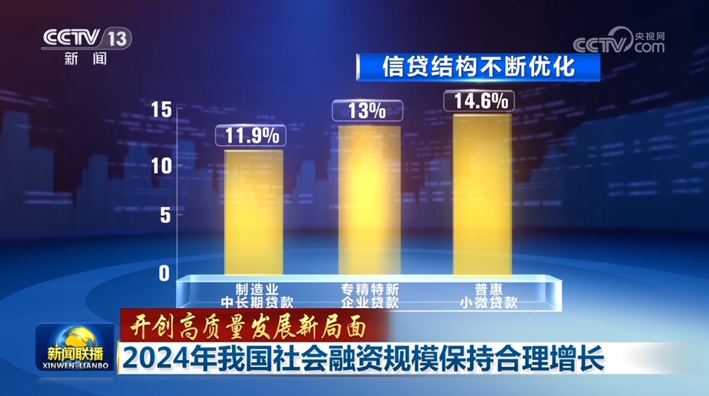 中國人民銀行相關(guān)負責人介紹,2024年12月末,社會融資規(guī)模存量為408.34萬億元,其中,對實體經(jīng)濟發(fā)放的人民幣貸款余額為252.53萬億元,同比增長7.2%。信貸結(jié)構(gòu)不斷優(yōu)化,制造業(yè)中長期貸款、專精特新企業(yè)貸款、普惠小微貸款增長較快,繼續(xù)高于同期全部貸款增速。