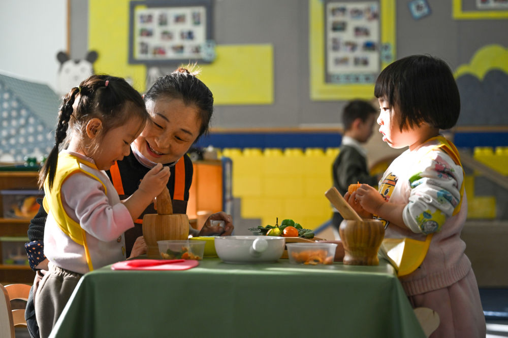 在青海省西寧市城中區(qū)一家托育中心,老師帶孩子們體驗(yàn)勞動(dòng)課程(2024年12月12日攝)。 新華社記者 張龍 攝