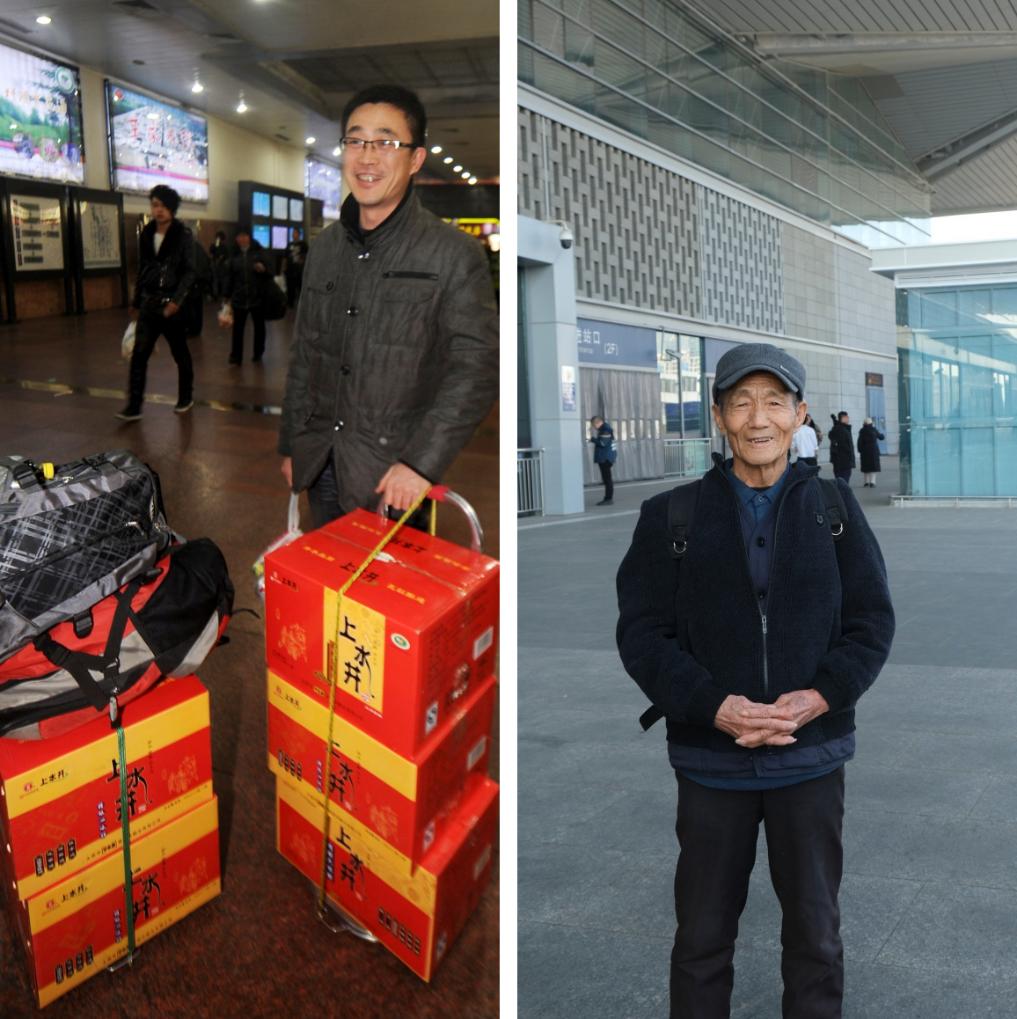 拼版照片。左圖為:2013年1月30日,來自內蒙古包頭的徐長青在太原站候車,他買了五箱山西老陳醋帶回家(新華社記者燕雁攝);右圖為:2025年1月18日,在太原南站,一位老人背著一個雙肩包輕松返鄉(xiāng)(新華社記者王學濤 攝)。新華社發(fā)