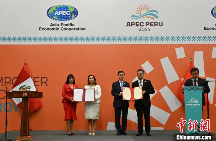 2024年11月15日,亞太經合組織第三十一次領導人非正式會議期間,中國香港與秘魯在秘魯利馬簽署自由貿易協(xié)定。圖為秘魯總統(tǒng)博魯阿爾特(左二)、秘魯外貿旅游部部長萊昂(左一)、香港特區(qū)行政長官李家超(右三)、香港特區(qū)政府商務及經濟發(fā)展局局長丘應樺(右二)完成簽署后合影。 香港特區(qū)政府新聞處供圖