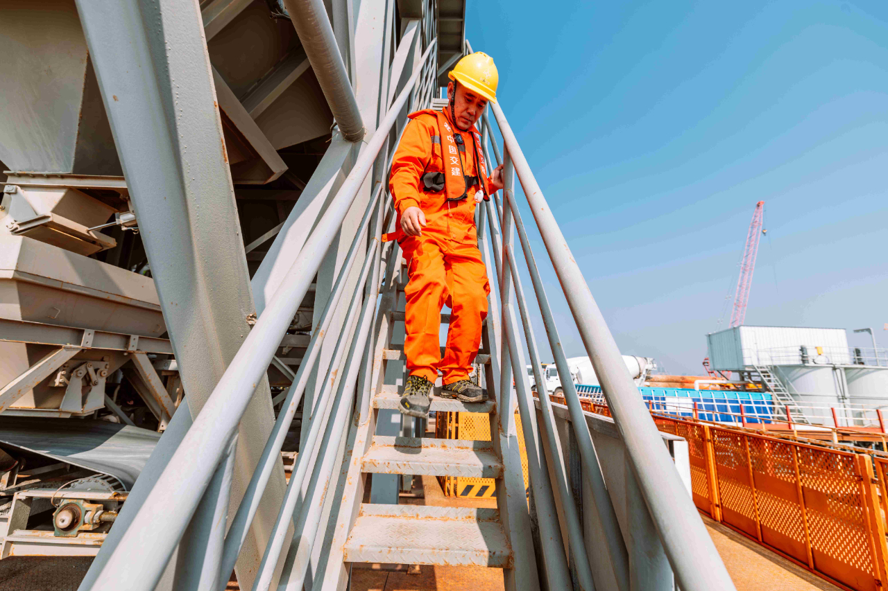 1月17日,夕陽下的廈門劉五店港區(qū),北風(fēng)勁吹。在距離中交一公局集團廈金大橋(廈門段)項目海上平臺混凝土操作員梁芝敬站立位置不到30米的洋面上,一艘船身印有“帆順168”字樣的補料船,裝載著4000多噸砂石緩緩抵近。船頭前方延伸出一條25米長的傳送皮帶,將船上的砂料源源不斷地送抵老梁眼前的鋼制固料斗內(nèi)。當(dāng)天他們要趁著海水退潮帶來的作業(yè)窗口,為站里補上700噸機制砂和900噸粒徑10到20毫米的小石子,以確?;炷琳旧a(chǎn)不停機。