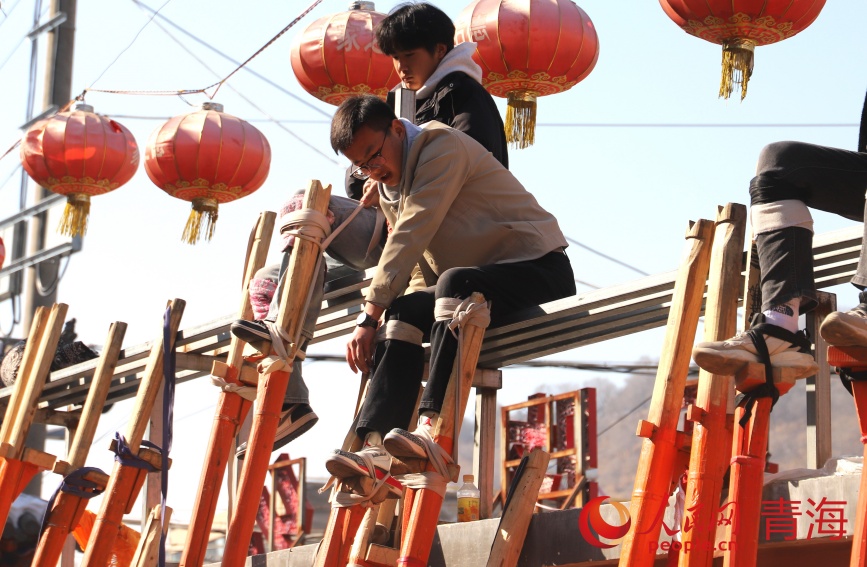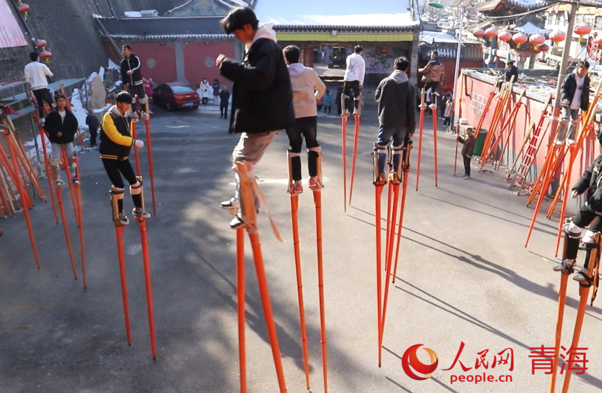 綁蹺、試蹺、定蹺……青海省西寧市湟中區(qū)魯沙爾鎮(zhèn)火神廟,魯沙爾高蹺隊(duì)迎來了春節(jié)前最后一次排練?!皬呐D月初一到現(xiàn)在二十多天了,今年大家積極性很高,報名的人也多,排練效果不錯?!弊龊脺?zhǔn)備,隨著社火音樂的鼓點(diǎn)舞動起來,魯沙爾鎮(zhèn)高蹺協(xié)會會長李玉龍站在臺階上看著排練隊(duì)形。