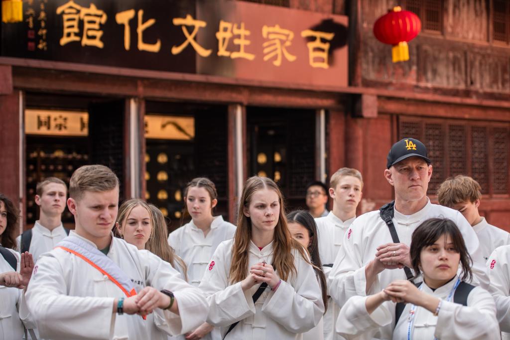 2024年3月22日,美國(guó)華盛頓州中學(xué)生代表團(tuán)成員在武當(dāng)山學(xué)習(xí)如何抱拳。新華社記者 伍志尊 攝