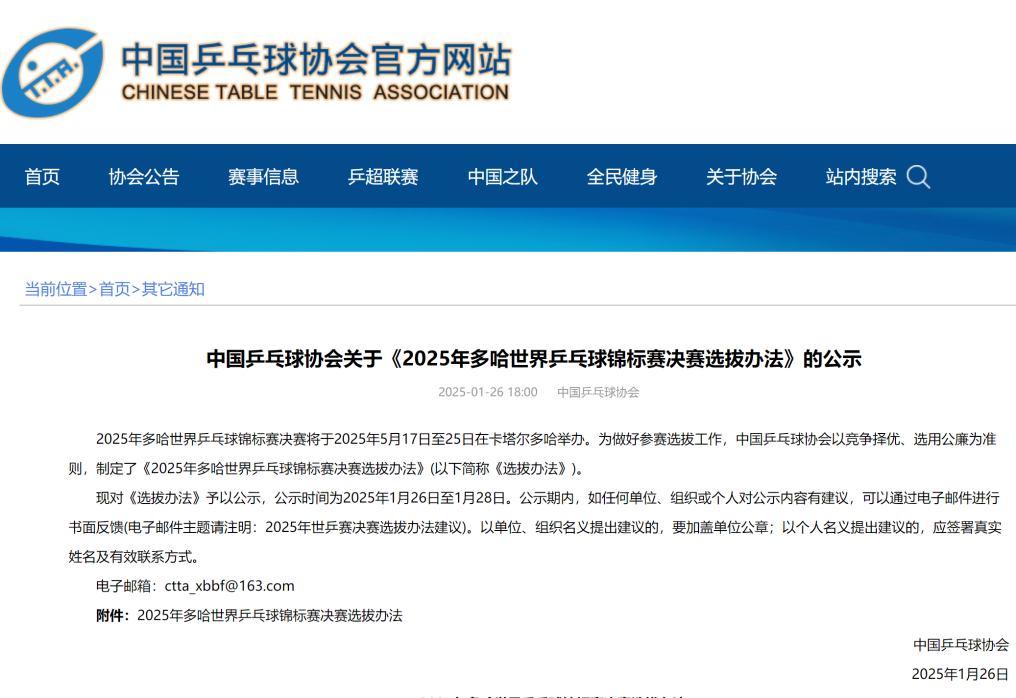 中國乒協(xié)26日在官網(wǎng)公示了《2025年多哈世界乒乓球錦標賽決賽選拔辦法》(以下簡稱《選拔辦法》)。