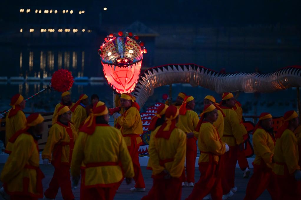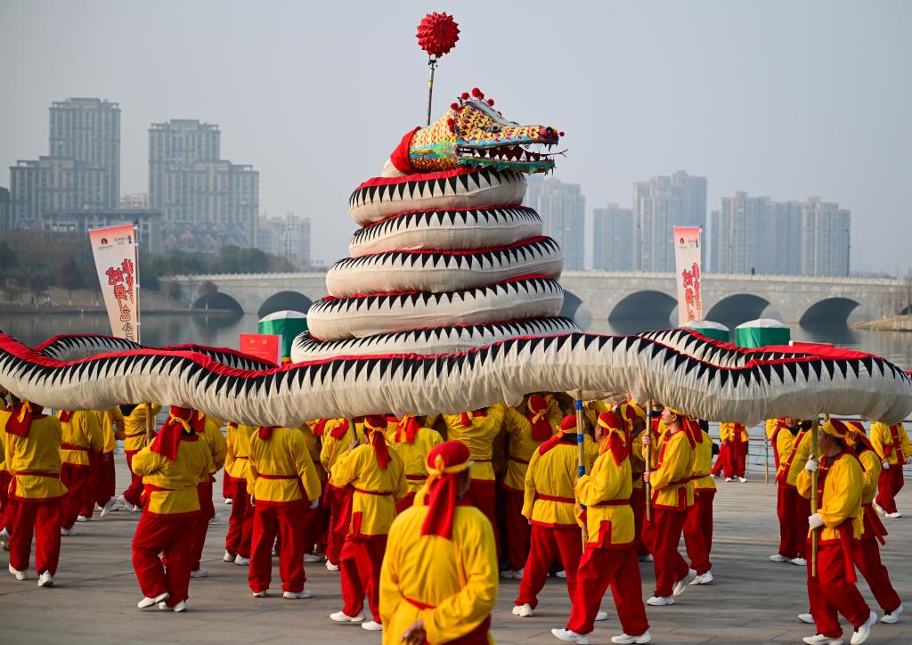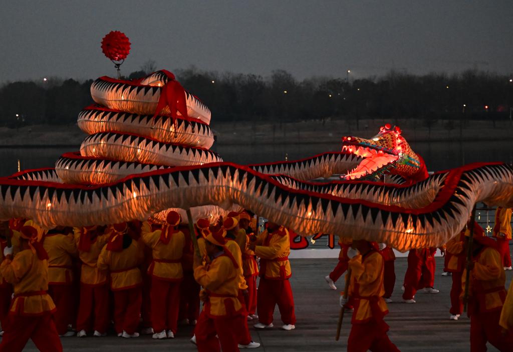 “出燈啦!”隨著一聲號令,鼓樂齊鳴,長達128米的“肥東洋蛇燈”起身游走,光彩靈動。蛇年春節(jié)臨近,安徽省合肥市肥東縣的和睦湖畔,通體流光的洋蛇燈在夜色中時而昂首,似騰空而去,時而垂頭,如蓄勢待發(fā)。