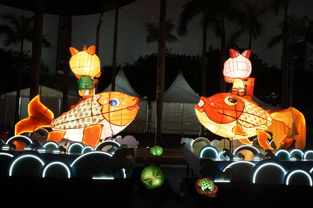 香港文化中心露天廣場上,一組由香港非物質(zhì)文化遺產(chǎn)辦事處策劃的扎作彩燈與四周景色相映成趣,錦鯉與金魚在水池上躍動,小醒獅站在魚背上嬉戲。
