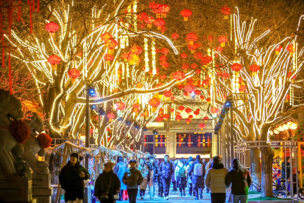 如意大街牌坊下的門簾卷起,一聲吆喝“開市啦”,瞬間吸引街上游人的目光。身著特色服飾的“店家”熱情地招呼迎客,將特色果仁、酥糖、熱茶湯等介紹給往來(lái)行人,賣冰糖葫蘆、精致糕點(diǎn)的“游商”穿梭其中,人們仿佛置身于舊時(shí)過(guò)年的熱鬧場(chǎng)景之中。