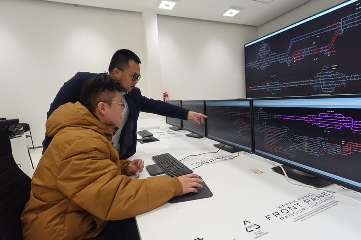 春節(jié)前夕,在匈塞鐵路塞爾維亞段項目位于諾維薩德的調(diào)度指揮中心,項目副總工程師楊冠嶺(后)詢問線路試運(yùn)行情況。新華社記者 陳穎 攝