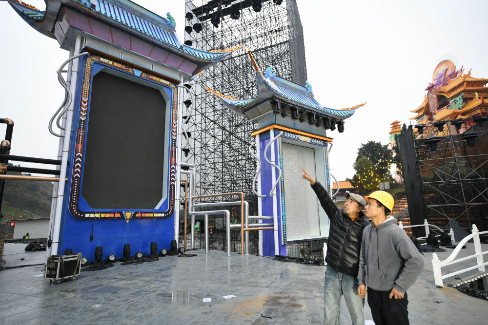 在第31屆自貢國際恐龍燈會主舞臺現場,萬松濤(左)與工作人員商討細節(jié),確保最終的呈現效果(1月14日攝)。