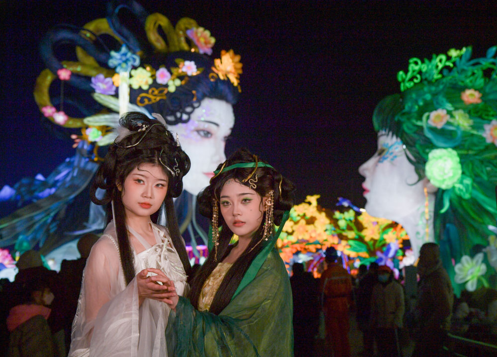 游客在第31屆自貢國際恐龍燈會彩燈燈組“青城雙姝”前留影(1月17日攝)。