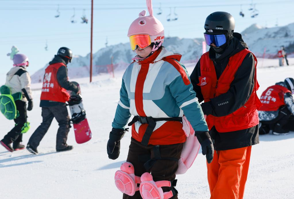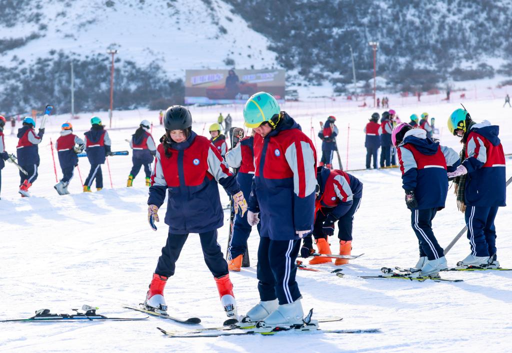 2024年12月25日,在位于烏魯木齊縣的新疆白云國(guó)際滑雪場(chǎng),烏魯木齊縣永豐中學(xué)的學(xué)生在上滑雪課。新華社記者 王菲 攝