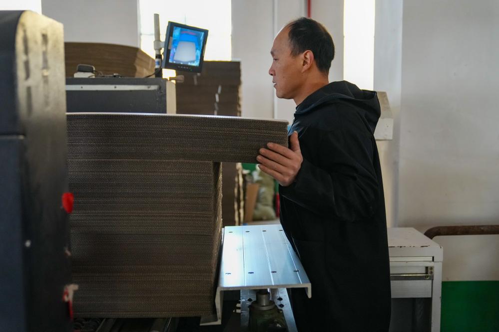 大瑤鎮(zhèn)一家花炮包裝企業(yè)的工人在搬運(yùn)紙箱。新華社記者 陳澤國(guó) 攝