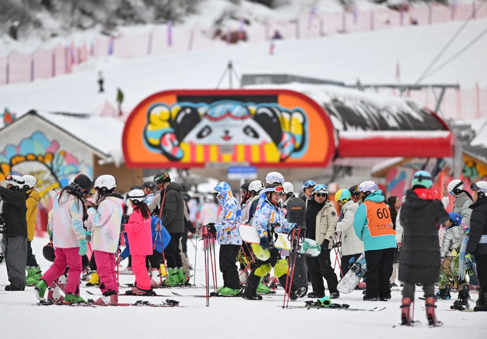 春節(jié)假期,眾多游客來(lái)到四川省阿壩藏族羌族自治州汶川縣羌人谷滑雪場(chǎng)游玩,在冰天雪地中歡度蛇年新春。
