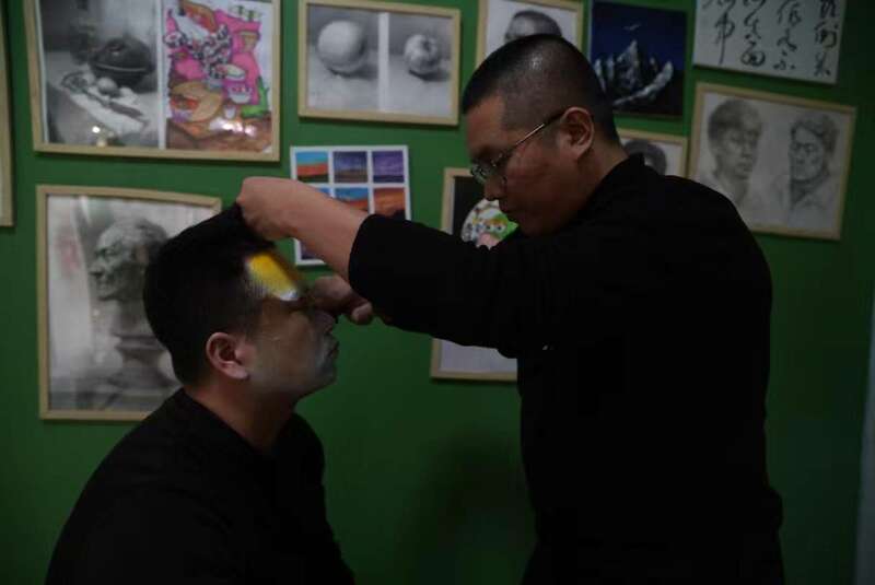 每次演出前,李曉濤要“擇臉”,決定哪張臉化哪個(gè)妝,臉大的演員有優(yōu)勢(shì),承得下更復(fù)雜更多細(xì)節(jié)的妝容;額頭高的人可以畫(huà)上半張臉細(xì)節(jié)更多的“三塊瓦”。畫(huà)著同一底色的演員表演時(shí)不能站在一起,以免觀眾有重復(fù)的感覺(jué)。