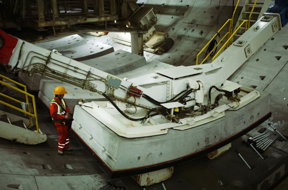 點(diǎn)點(diǎn)“星光”盡頭,拼裝班長(zhǎng)周洪強(qiáng)操作伸縮機(jī),將一塊隧道管片緩緩抓起。穩(wěn)穩(wěn)平移、旋轉(zhuǎn)過(guò)后,12噸重的管片精準(zhǔn)落位。