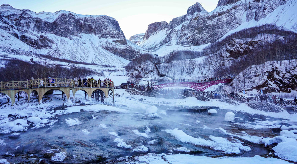 在長白山天池下方的一道山谷里,來自廣東的游客林綺雯逆著汩汩流淌的二道白河,行走在觀覽長白瀑布的途中。不遠處,星羅棋布的溫泉口騰起水霧,涌流的溫泉水分開白色的雪原。